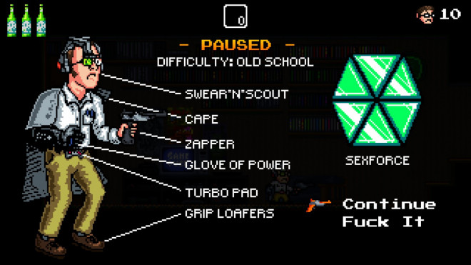 ANyway you have your pew-pew shooter which is NES zapper. There are also other items that will somehow makes this turd game feels slightly more tolerable.There are Power glove (let's you crush stone blocks), NES Dancing pad (Glide for gliding) Nintendo helmet, sorry forgot the name (let's you see hidden platforms and items), loafers (wall jumping) and turbo pad which is bullshit it doesn't give you turbo shot instead it is charge shot. Apart from regular platforming levels there are side scrollers and underwater levels. Enemies are not hard to deal with if you just fight one flat ground. But combining with shitty platforming (+ difficulty you pick) it will turn in quite frustrating experience. I mean Nerd can shoot in all direction and there is a lock in place button. But more often you'd have to neglect it due to circumstances. There are also other collectibles and items. You can collect 4 NES cartridges in each none boss stage, but that shit doesn't do anything it's just for achievement. The other items are health pick ups and secondary weapon. There are 3 secondary items. Stones, bombs and beer kegs. First two are nearly useless and bear keg restore full health. It is useful even on harder difficulties.