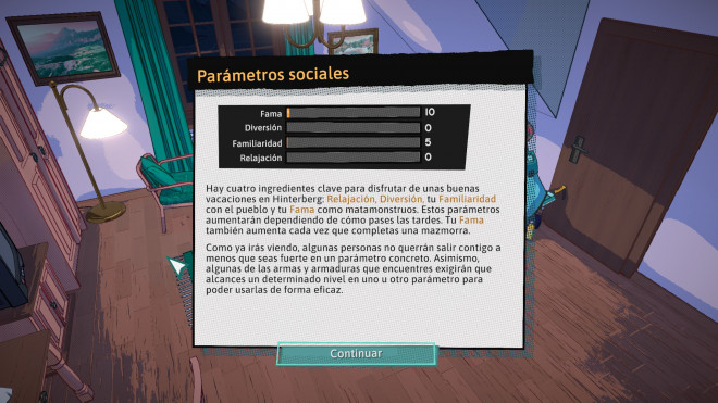 Since we also use armor and swords, we have the traditional stats: attack, defense, magic, and magic defense; but we also have social parameters: relaxation, fun, familiarity and fame. These are useful for our interactions and access to new dungeons. One good thing is that some amulets use these parameters to improve stats, so it's a good way to remain useful even in the adventure.