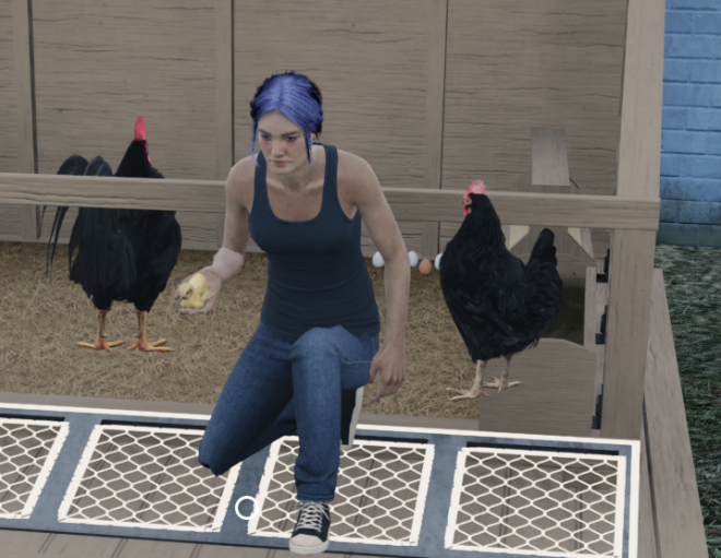 This image shows our first baby chicken in the game. One thing the game doesn’t explain is that the mother hen will attack you if you pick up a fertilized egg. She keeps attacking until she’s satisfied, which can quickly drain your health. To avoid this, you need to use an egg light to check whether an egg is fertilized before picking it up. Once you confirm it’s safe, you can place the egg in a basket. Fertilized eggs won’t hatch unless you put them back on the ground or inside the coop. The large coop that holds 20 chickens is very useful, especially because of the storage drawers on the sides, but the chickens often get stuck on the front ramp. On top of that, it felt like it took forever for the eggs to hatch—almost 17 in-game years!