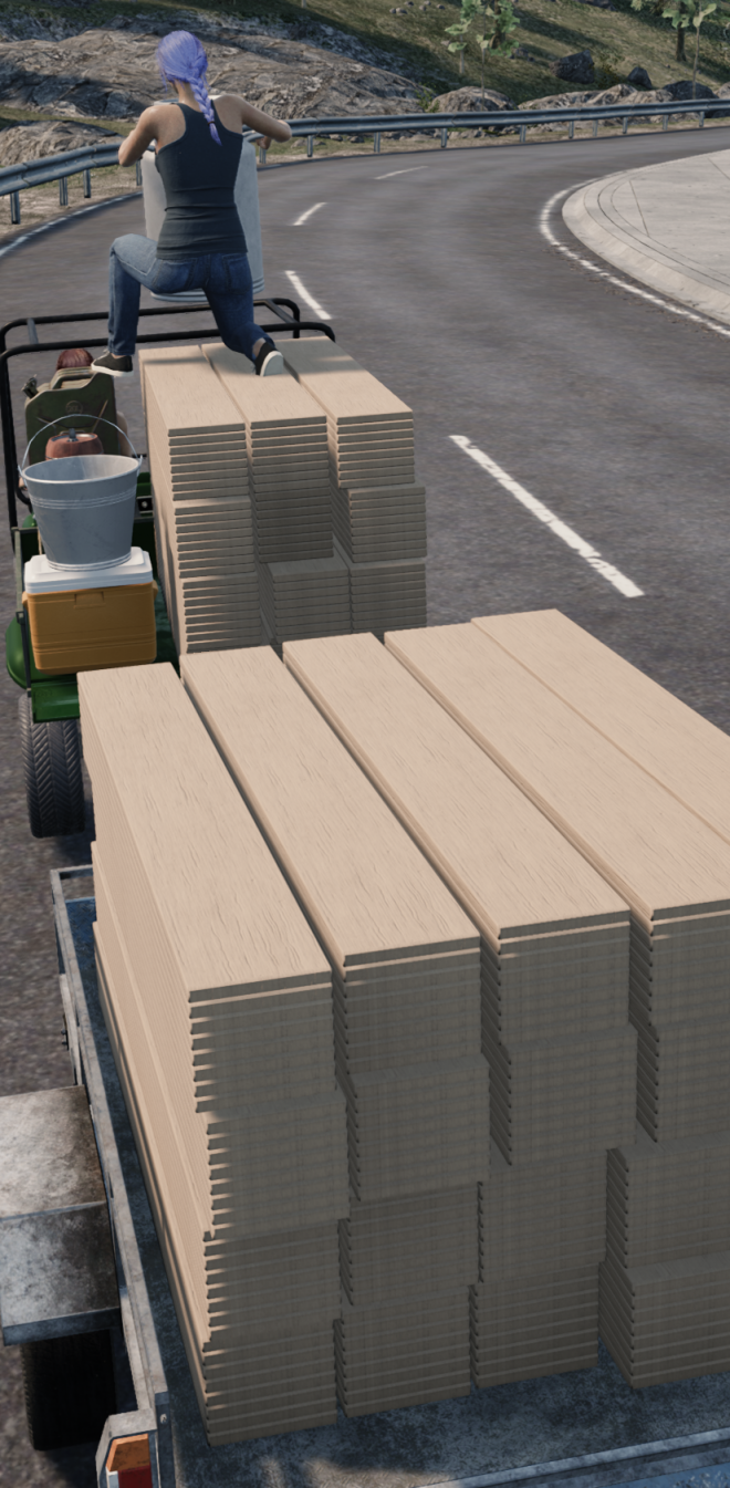 This image shows our first plank purchase in the game. When we first started, there were plenty of trees on our farm, but they were quickly used up. After searching online for ways to make money fast, we discovered the treasure quest, which helped us earn enough to buy wood planks from the hardware store. The planks come in stacks of eight, and we had to load them onto the trailer one by one before heading back to the ranch. The trip home was incredibly rough. The trailer constantly fishtailed behind the go-kart we were using, and it quickly became clear that the vehicle isn’t great for hauling trailers due to its speed and tendency to flip. The trailer physics also acted strangely at times. At one point, I even saw my friend get launched out of the car mid-air while she was driving.